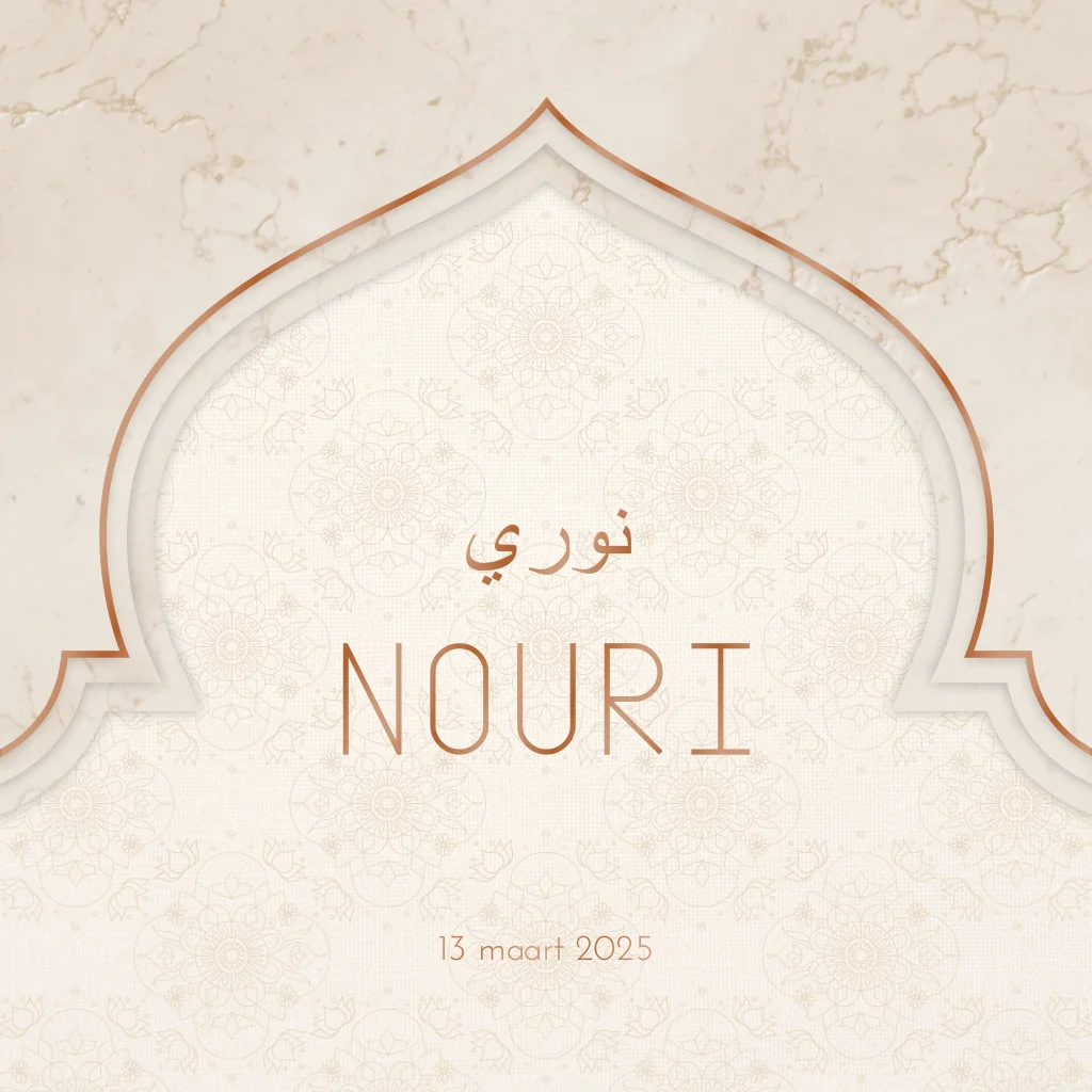 Uniek geboortekaartje voor de geboorte van jullie kindje met prachtige arabische vormen en details die in koperfolie zijn gedrukt. De tekst aan de binnenkant van het kaartje worden ook in koperfolie gedrukt en geven dit kaartje een extra luxe uitstraling.