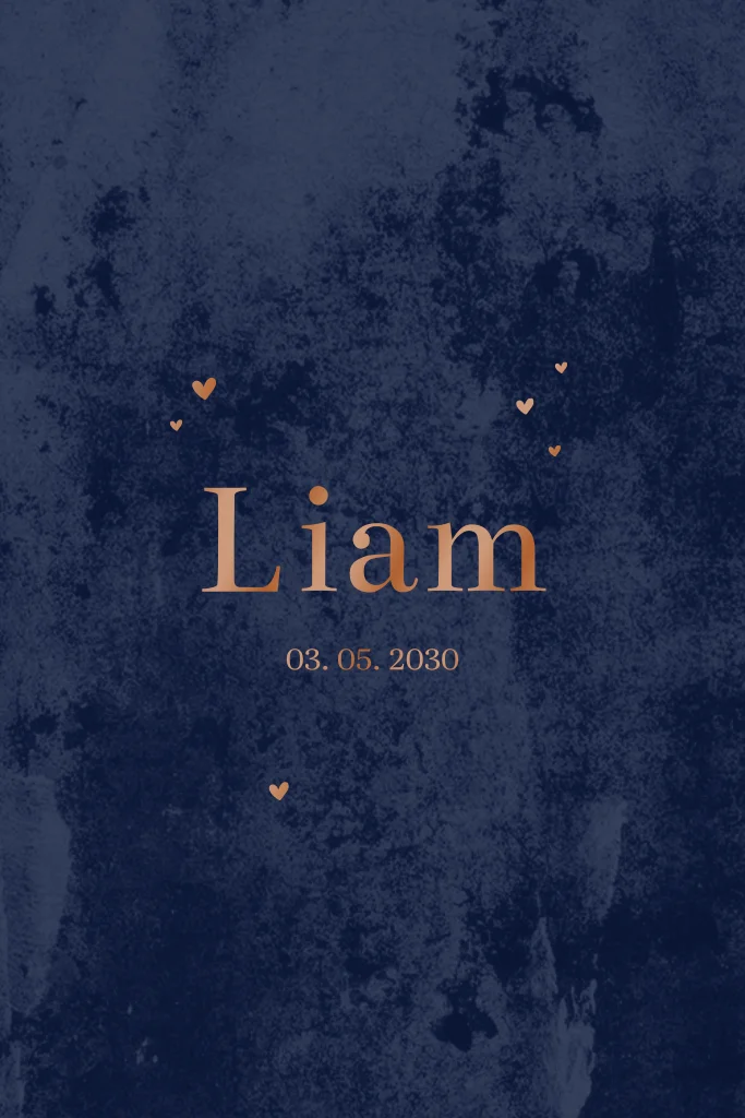 Kondig de geboorte van jullie zoontje aan met dit prachtige kaartje! De combinatie van de donkerblauwe velvet-look achtergrond en hoogglans opdruk staat prachtig. De hartjes geven dit kaartje een lief effect. Ook zo'n fan van dit kaartje? Bestel een proefdruk en bewonder dit kaartje in het echt!