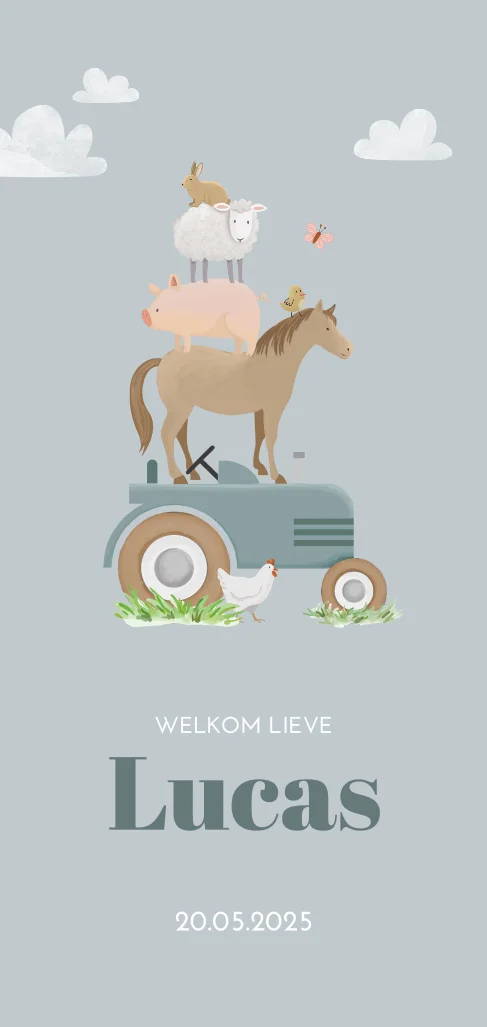 Een langwerpig geboortekaartje voor jouw kindje. Het kaartje heeft een grijs/blauwe achtergrond met daarop leuke boerderij dieren. Je ziet een paard, varken, schaapje en konijn. Daarnaast zie je een tractor en wolkjes.