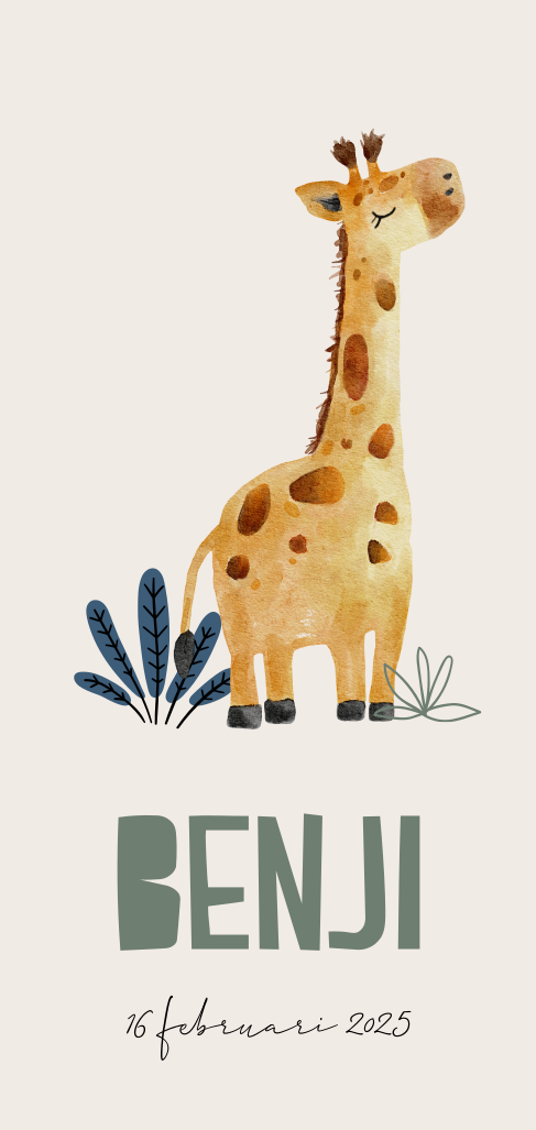 Wat een vrolijk geboortekaartje voor jouw kleintje. Dit kaartje heeft een langwerpig formaat met ronde hoeken. Op de voorkant van het kaartje zie je een vrolijke illustratie van een giraffe. Pas het kaartje naar wens aan in onze online editor.
