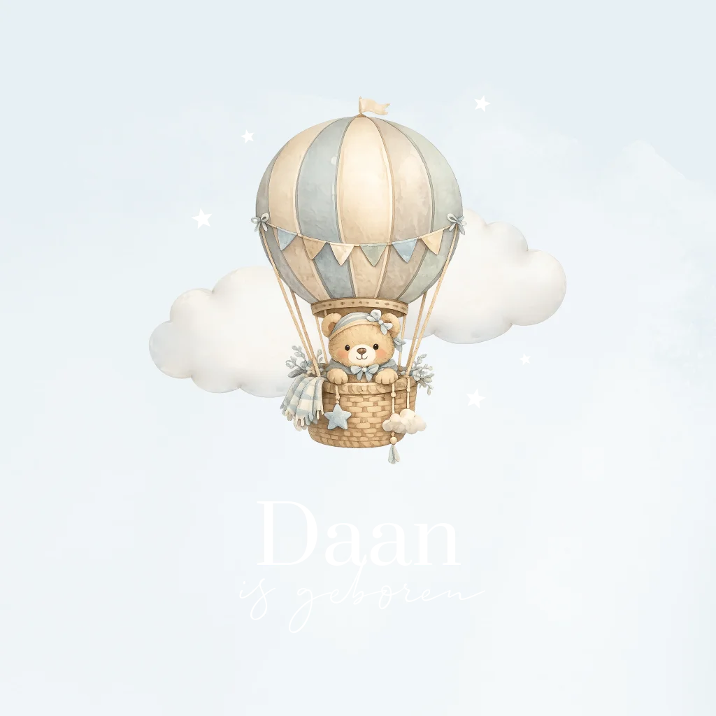 Lief geboortekaartje met beertje in luchtballon, sterren en wolkjes