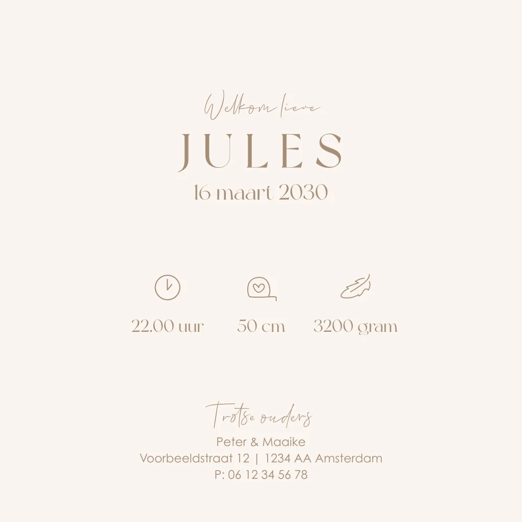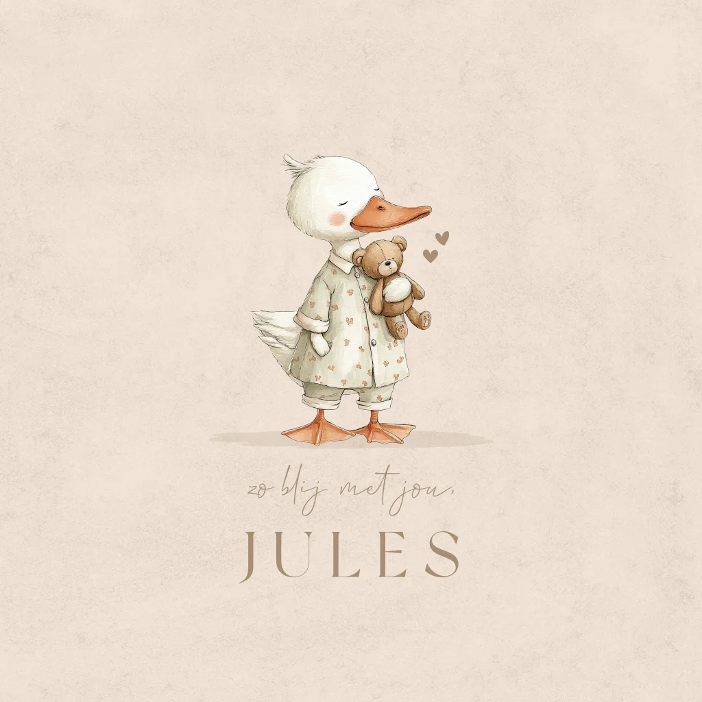 Een schattig geboortekaartje met eend en knuffel beertje op een beige achtergrond. Pas het ontwerp eenvoudig aan in onze online editor.