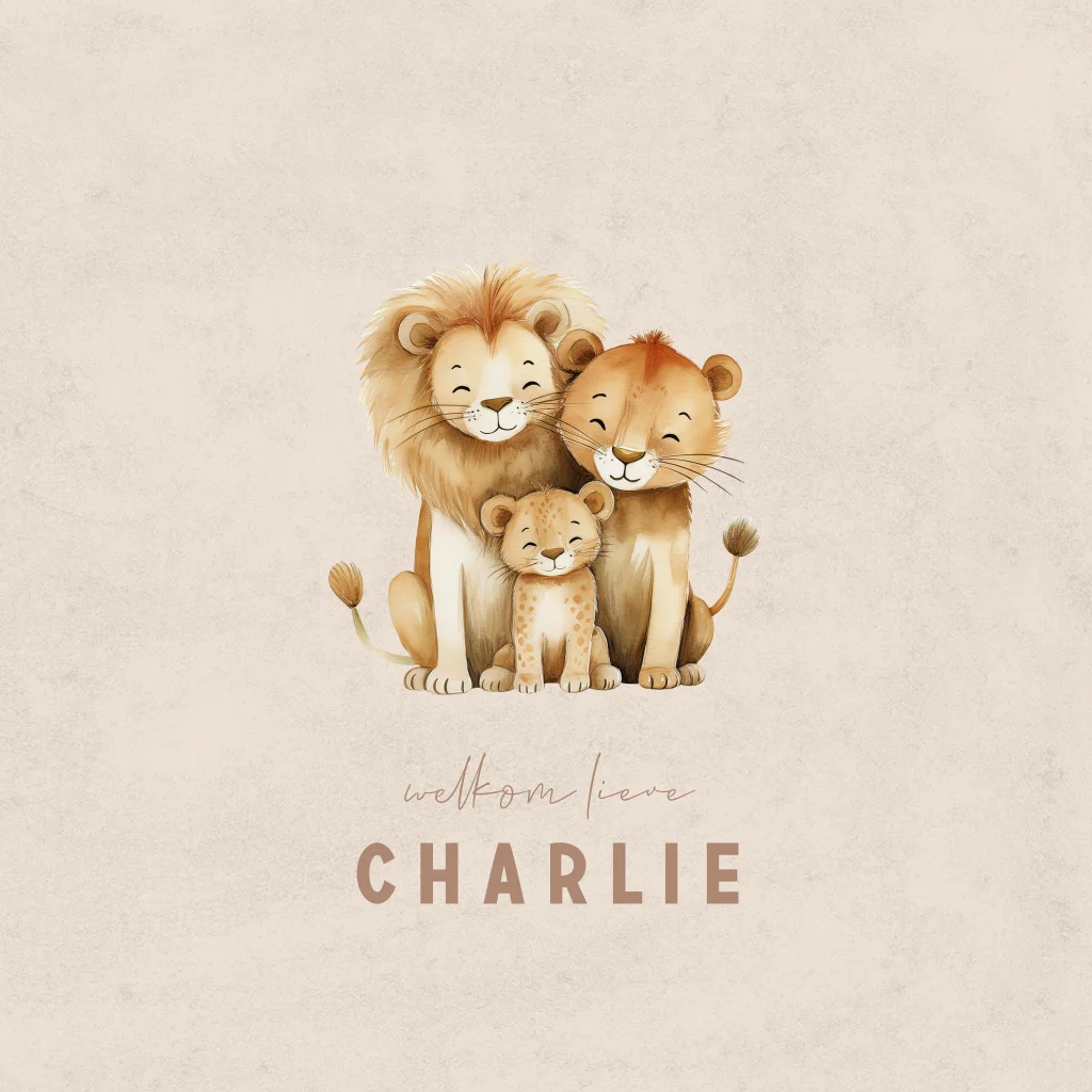 Kondig de geboorte van jullie zoon of dochter aan met dit lieve kaartje. Het kaartje heeft een lichte beige achtergrond met getekend zittende leeuwenfamilie. Ook zo'n fan van dit kaartje? Bestel een proefdruk en bewonder dit kaartje in het echt!