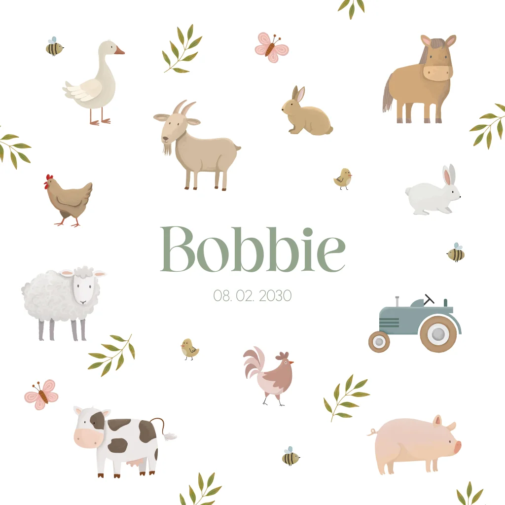 Wat een vrolijk kaartje! Het ontwerp heeft vrolijke illustraties van verschillende boerderijdieren. In het midden lees je de naam van jouw kindje. Pas het ontwerp naar wens zelf aan.