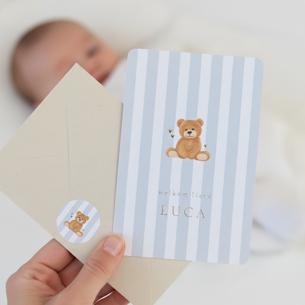 Dit staande kaartje heeft een blauw streepjes patroon met goudfolie details. Daarnaast zie je een lieve illustratie van een beertje. We hebben ook een meisjesvariant van dit kaartjes.