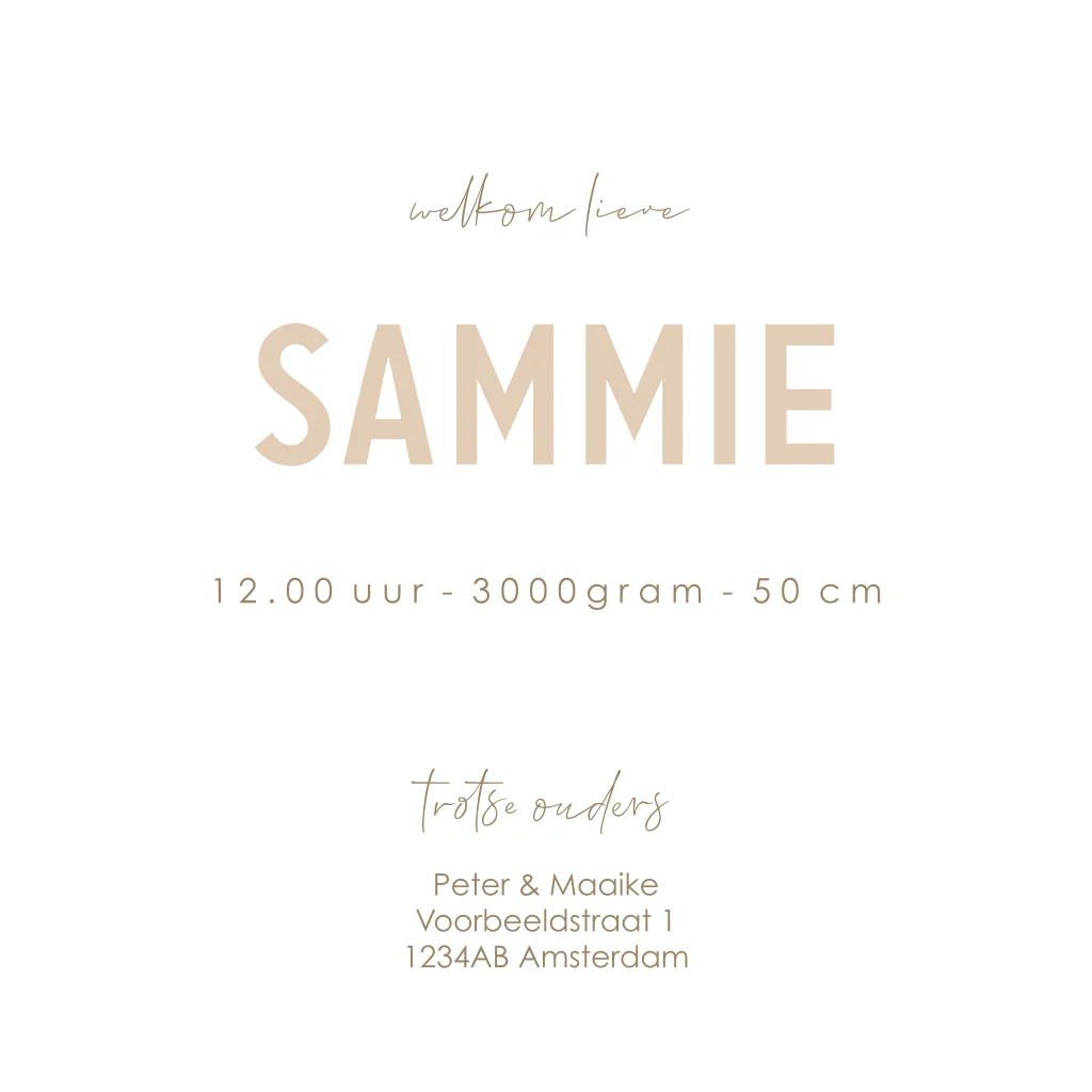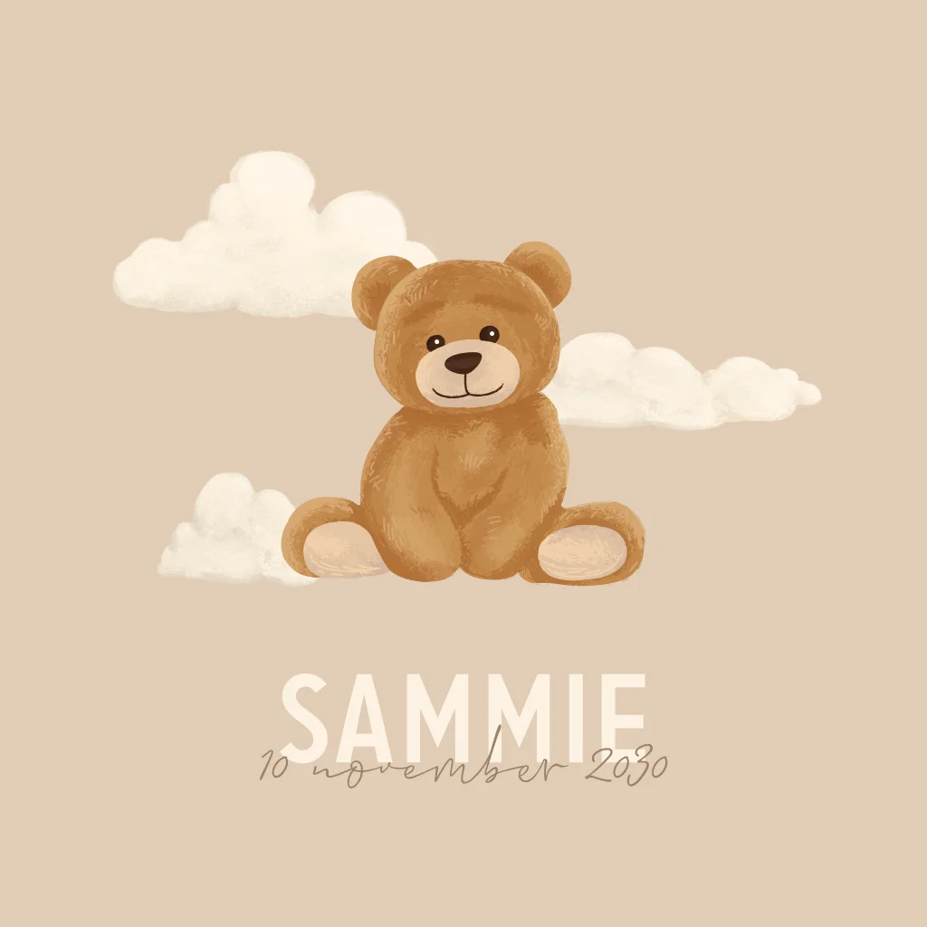 Een lief en zacht geboortekaartje met beige achtergrond. Het kaartje heeft een lief teddybeertjes omringd door wolkjes. Onder de beer lees je de naam en geboortedatum van jouw kindje. Pas het kaartje naar wens aan in onze online editor.