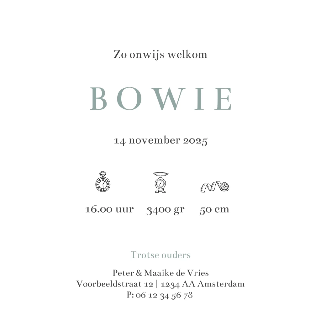 Minimalistisch geboortekaartje in de kleur zeegroen voor een jongen of een meisje.