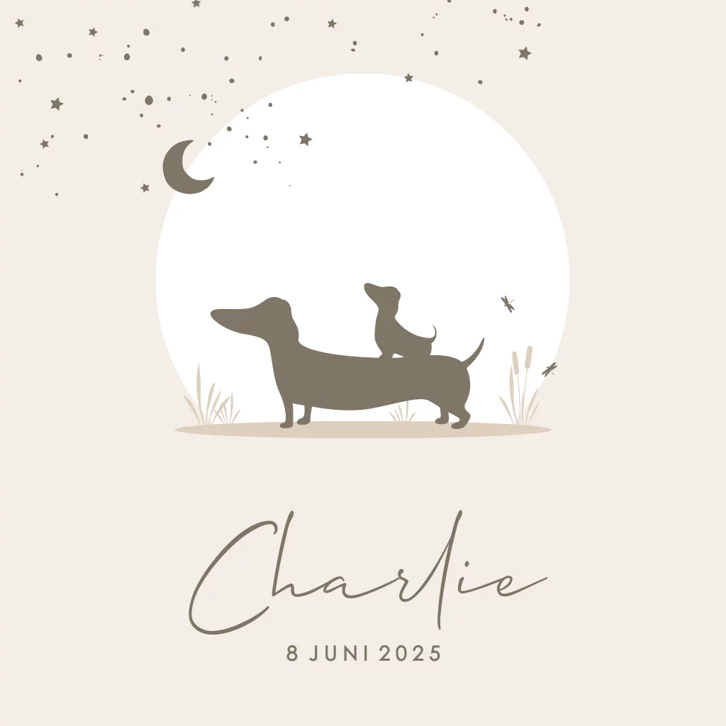 Een schattig neutraal geboortekaartje voor jouw kindje. Het kaartje heeft verschillende bruine en beige tinten. Je ziet een grote teckel samen met een kleine teckel kijken naar de sterrenhemel. Pas het kaartje gemakkelijk aan in onze online editor.