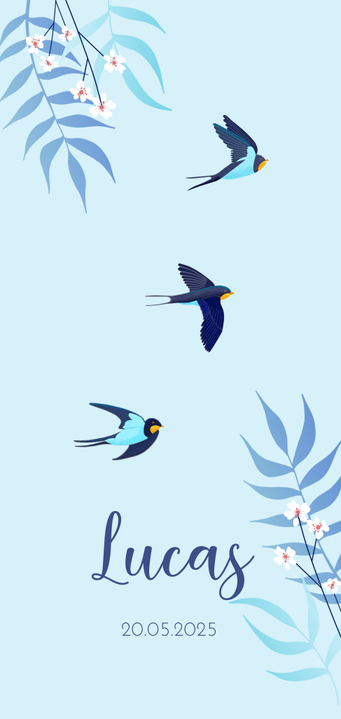 Een lief kaartje om de geboorte van jullie zoon mee te vieren. De achtergrond is lichtblauw en in twee hoeken zijn mooie bladeren in verschillende tinten te zien. De vliegende zwaluwen in het midden trekken meteen de aandacht.