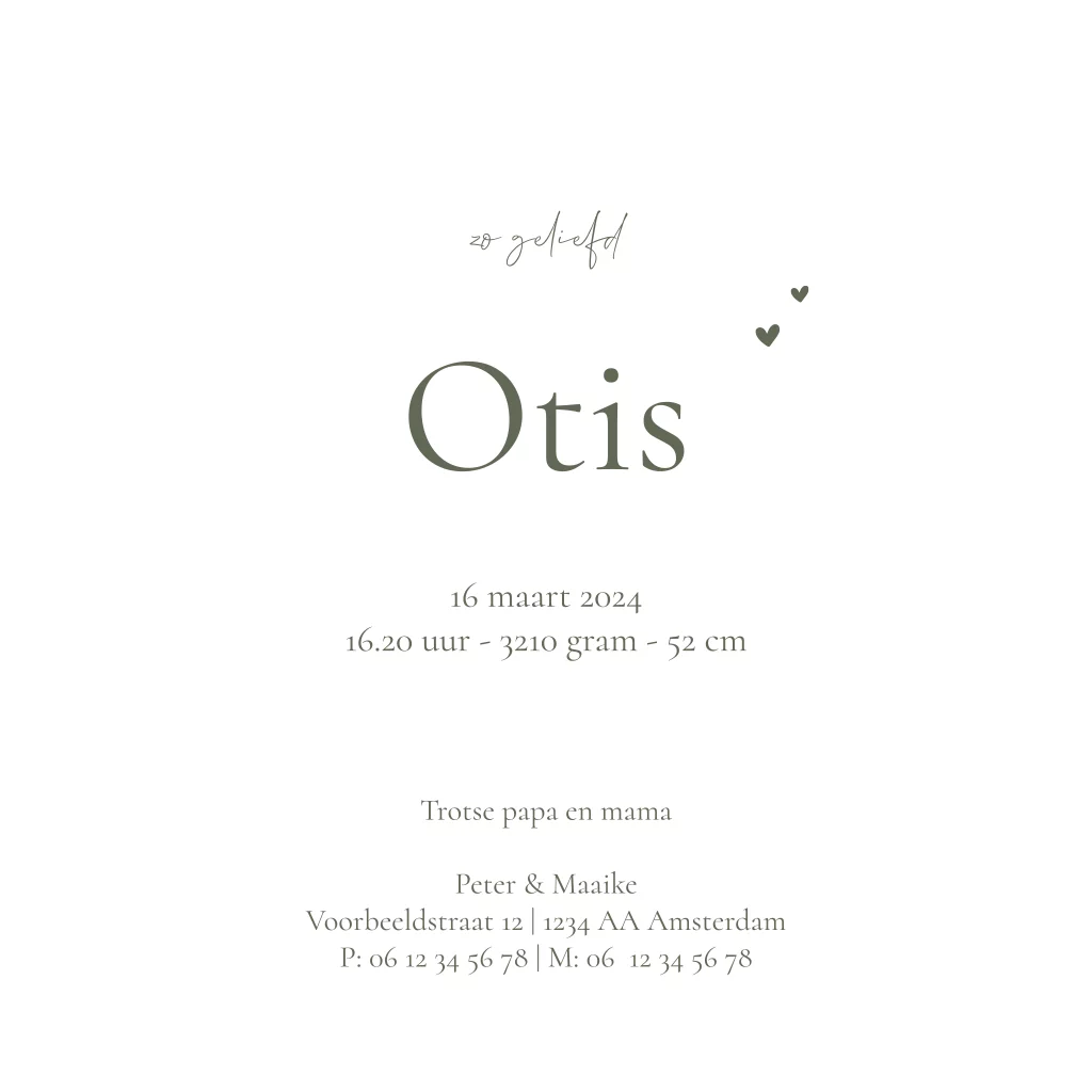Kondig de geboorte van jullie zoon of dochter aan met dit stoere kaartje! Het kaartje heeft een groene velvet-look achtergrond. De kleine hartjes geven dit kaartje een lieve uitstraling. Pas het kaartje naar wens aan in onze online editor en bestel een proefdruk om dit kaartje in het echt te zien!