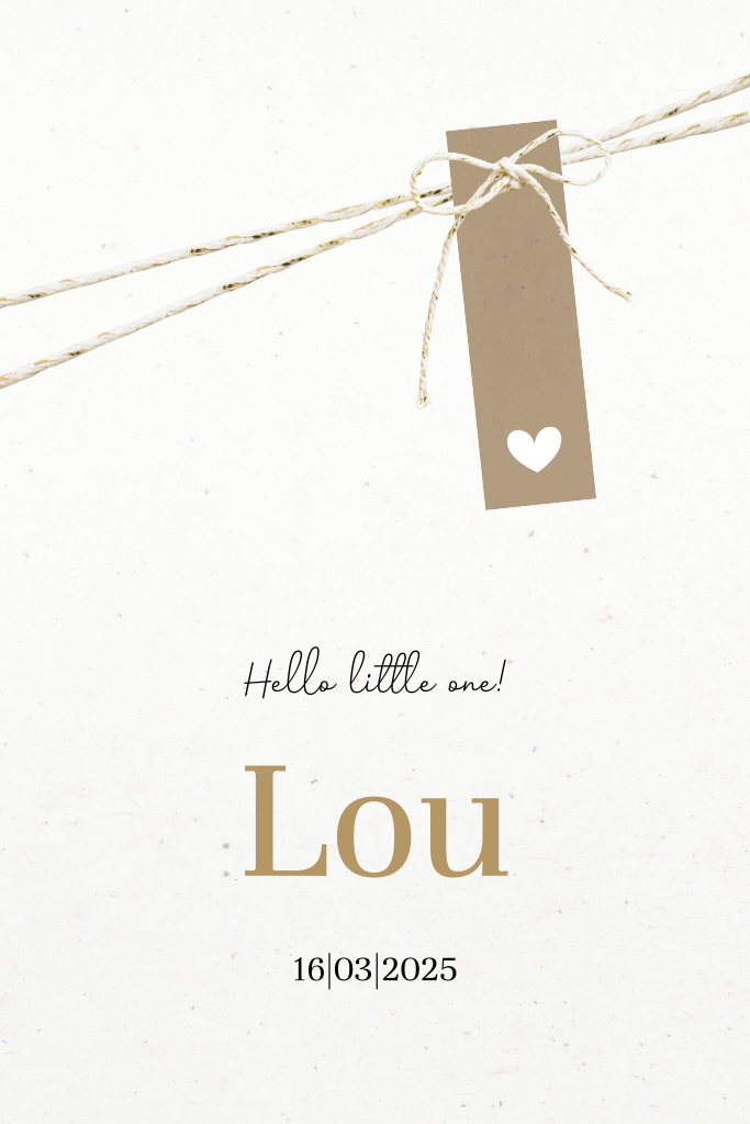 Een schattig geboortekaartje voor jullie kindje. Het kaartje heeft een witte achtergrond. Het kaartje heeft verschillende toffe typografie. Het labeltje en touwtje op dit kaartje zijn gedrukt. Let op! Dit betekent dus dat je deze niet los erbij worden geleverd.