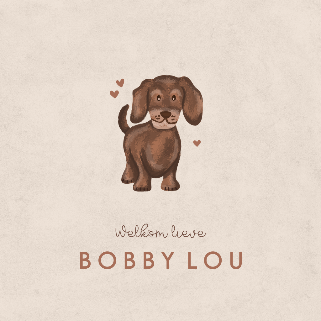 Velvet-look geboortekaartje met illustratie teckel en hartjes