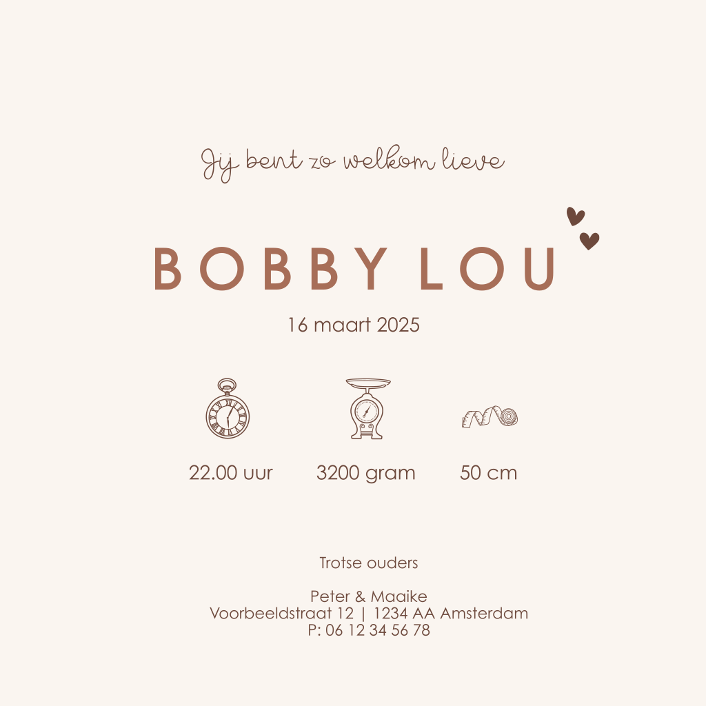 Een stoer maar ook lief geboortekaartje voor de geboortekaartje van jouw kindje. Het kaartje heeft een toffe velvet-look achtergrond. Daarnaast zie je een schattige illustratie van een teckel. Pas het kaartje naar wens aan in onze online editor en bestel een proefdruk om het kaartje in het echt te bewonderen.