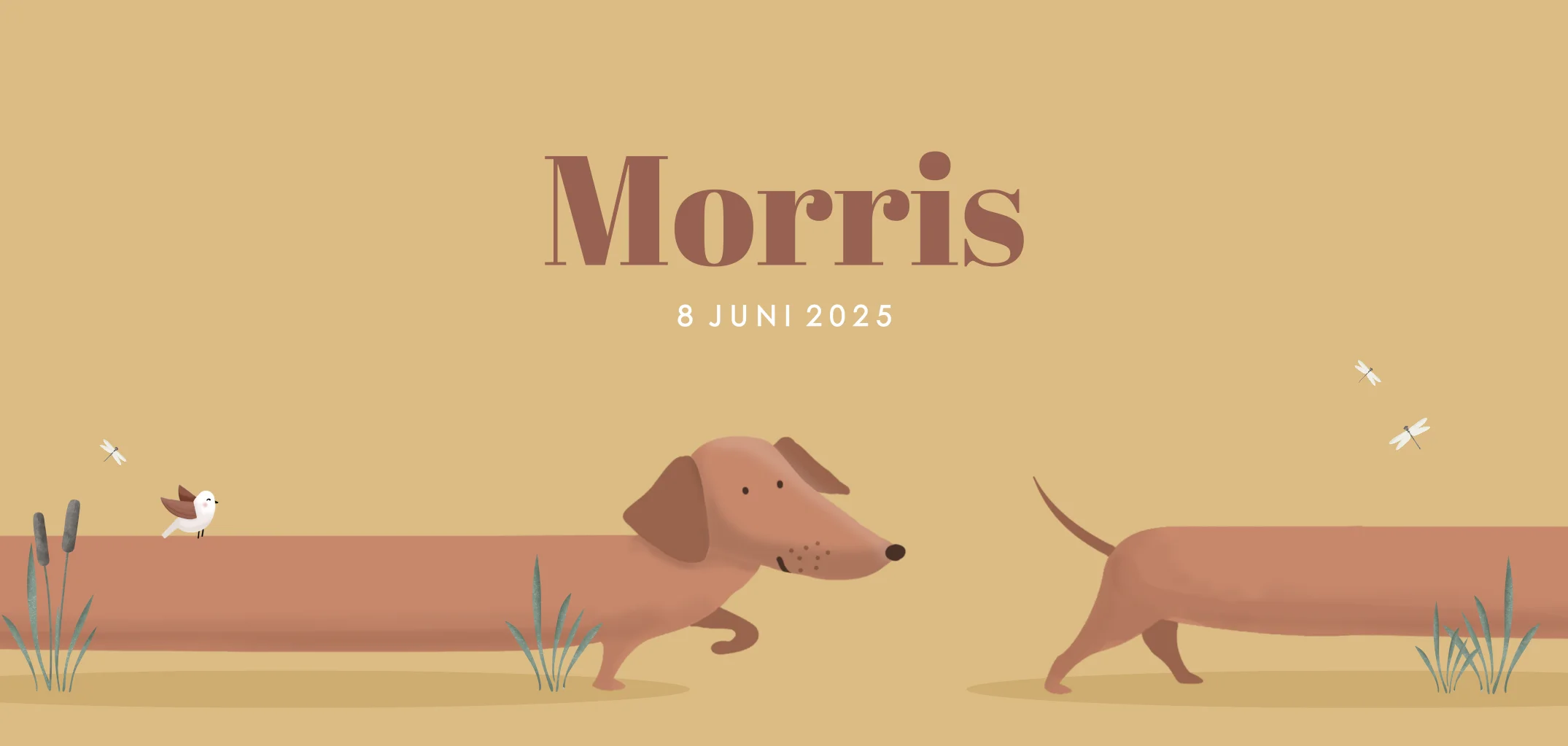 Een mosterdgeel geboortekaartje met een vrolijke lange teckel. Het hondje loopt door de natuur en krijgt gezelschap van een vogeltje en libellen. Het kaartje is volledig naar wens aan te passen. Bestel een proefdruk om het kaartje in het echt te bewonderen.