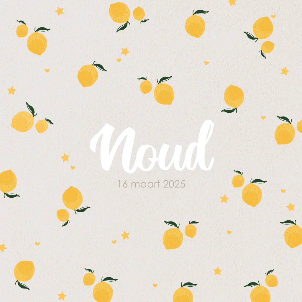 Een vrolijk geboortekaartje voor de geboorte van jullie kindje. Het kaartje heeft een zandkleurige achtergond met daarop vrolijke citroentjes. Tussen de citroentjes staan ook sterretjes en hartjes. De naam van jullie kleintje staat in sierlijke letters in het midden geschreven. Maak het kaartje af naar je eigen wensen in de online editor, bestel een proefdrukje en bekijk het kaartje thuis.