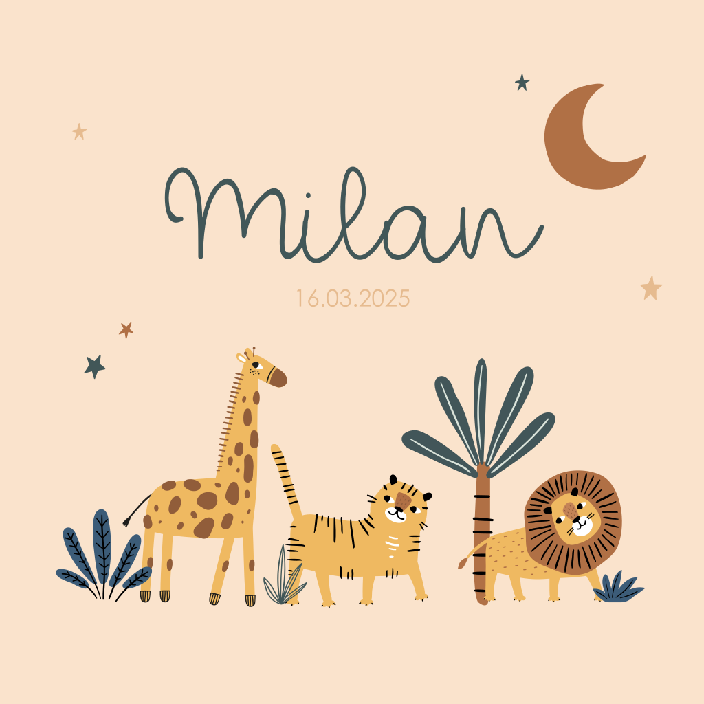Wat een tof geboortekaartje. Dit geboortekaartje heeft een hippe jungle dierenparade op de voorkant. Je ziet een giraffe, tijger en leeuw lopen onder een sterrenhemel. Het kaartje heeft een vierkant formaat en is naar wens aan te passen in onze online editor.