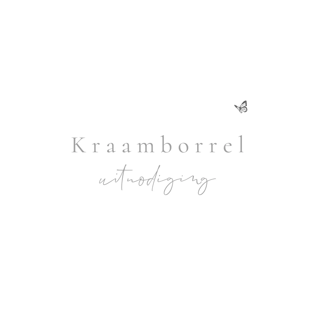 Een stijlvol minimalistisch kraamborrelkaartje om jouw dierbaren uit te nodigen. Het kaartje heeft een rustige uitstraling met grijze letters. Daarnaast zie je een lief klein vlindertje. Pas het ontwerp naar wens aan in onze online editor.