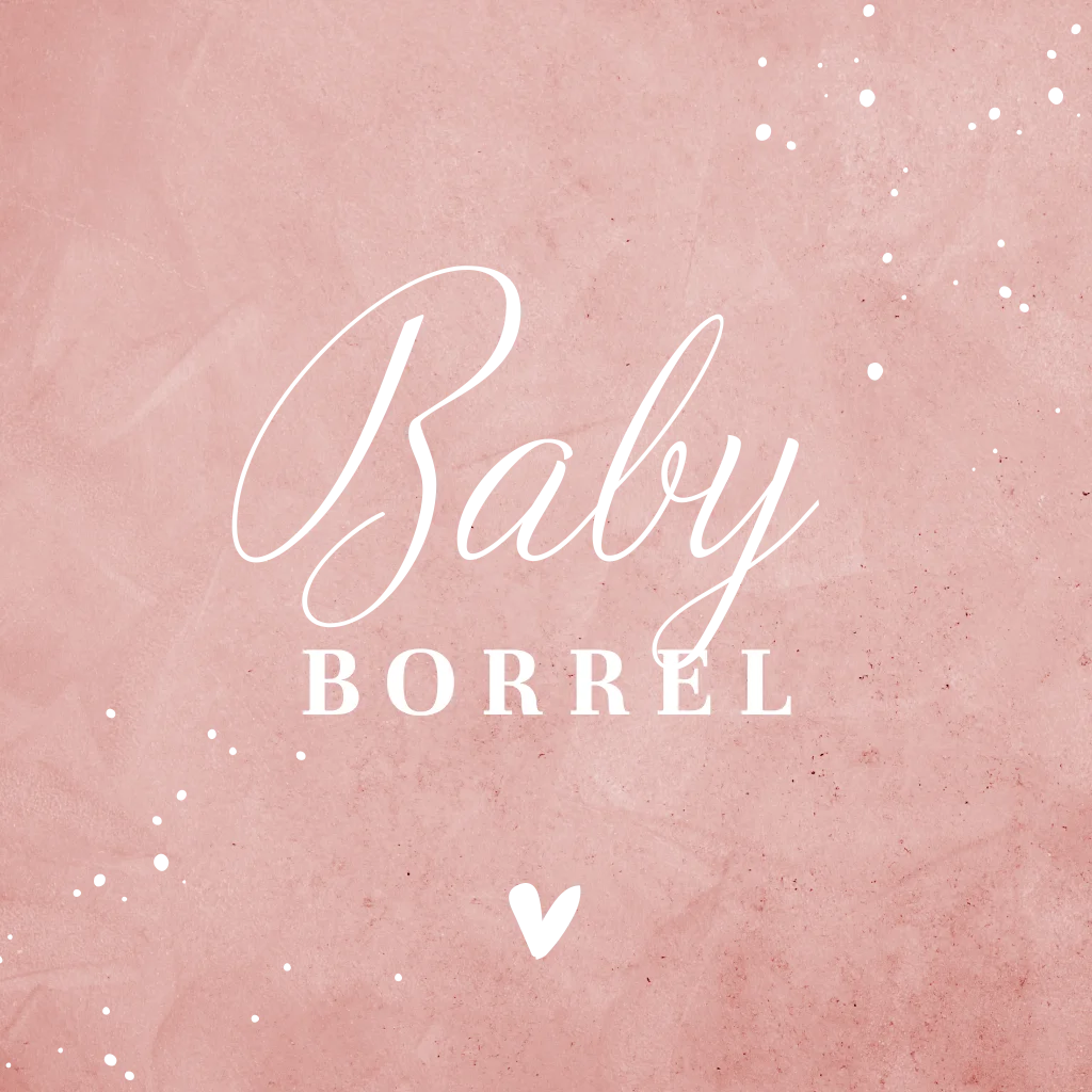 Nodig familie en vrienden uit voor de babyborrel ter ere van de geboorte van jullie dochtertje met deze mooie roze kraamborrelkaart. Op de roze velvetachtergrond staat de tekst in wit en roségoudfolie met een klein hartje eronder en spetters aan de rand.