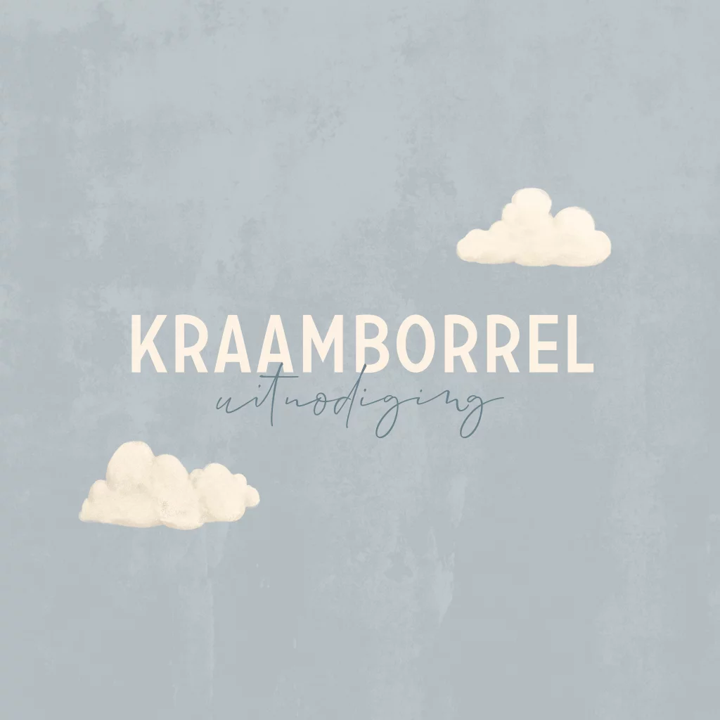 Een hip kraamborrel uitnodiging in blauwe velvet-look. Het kaartje heeft een minimalistisch ontwerp met wolkjes. Pas het ontwerp naar wens aan in onze online editor.