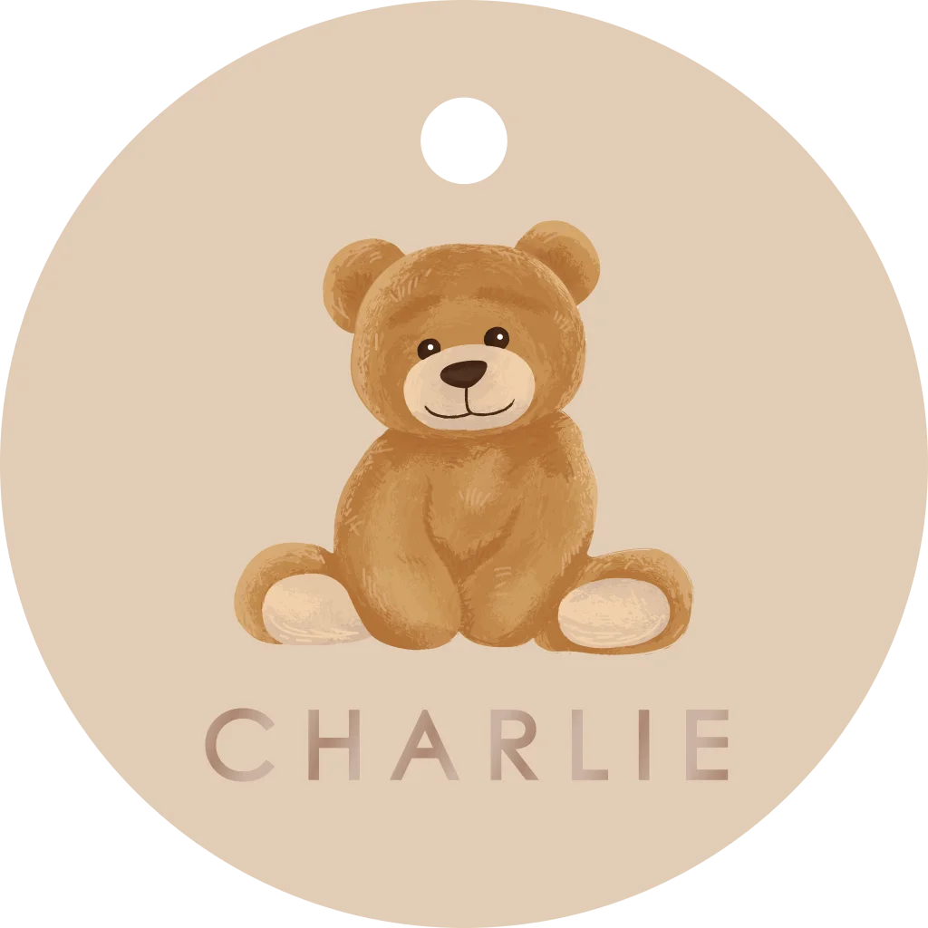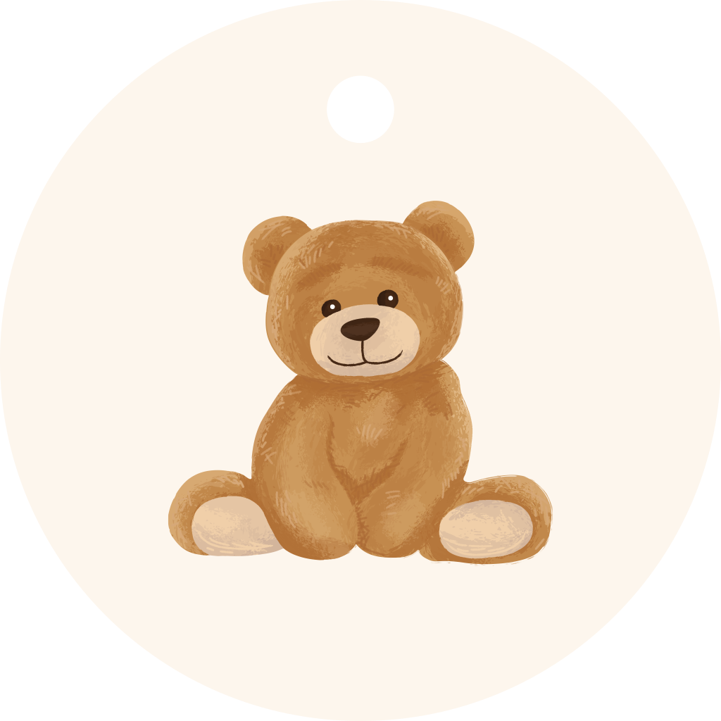 Wat een schattig labeltje! Het labeltje heeft een gebroken witte achtergrond met daarop een lief teddybeertje. Bewerk het cirkel labeltje in onze online editor en maak hem volledig naar je eigen wensen.