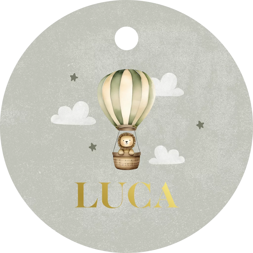 Doopsuiker labeltje in de stijl van het geboortekaartje. Dit labeltje heeft een groene achtergrond met daarop een luchtballon met leeuwtje. Pas het ontwerp naar wens zelf aan.