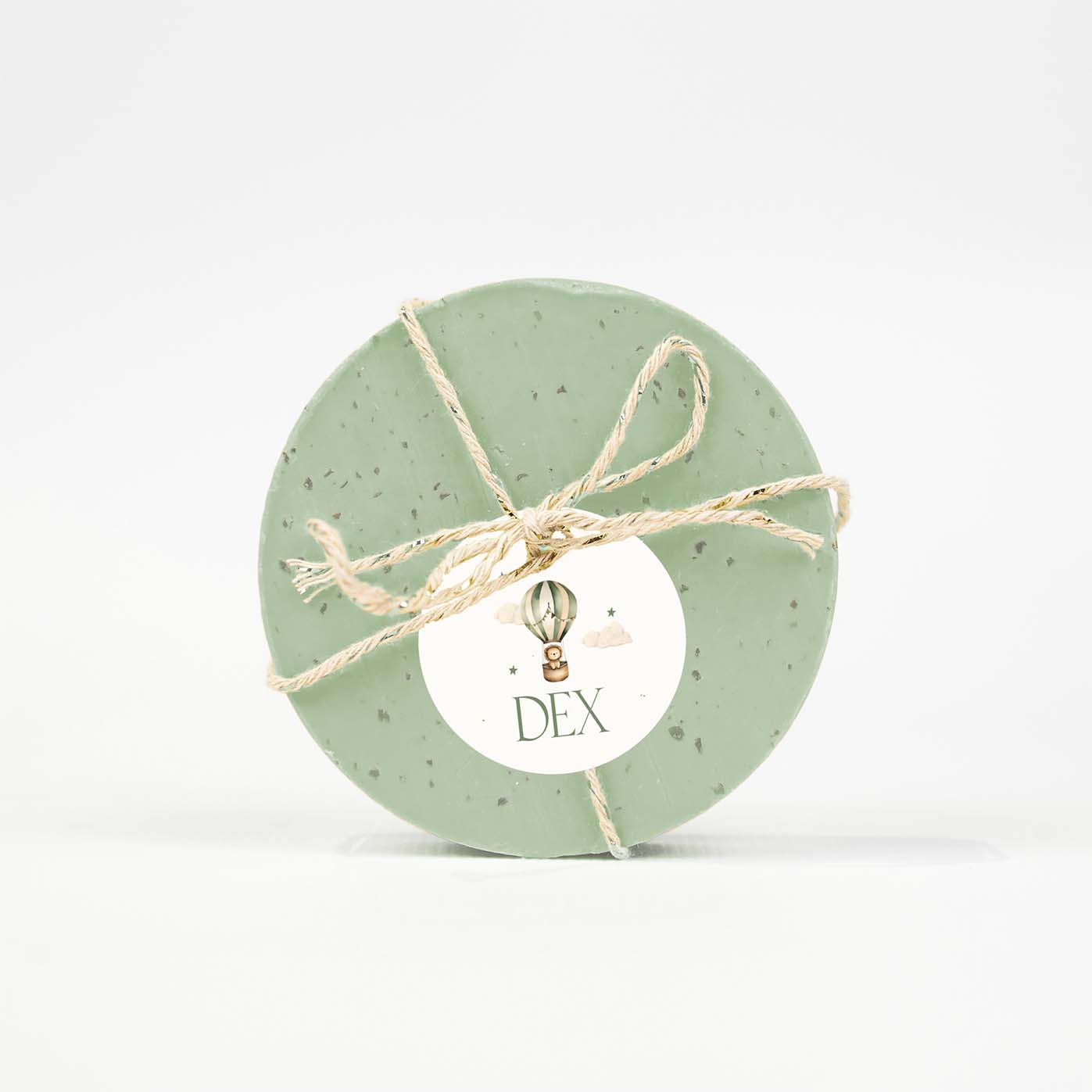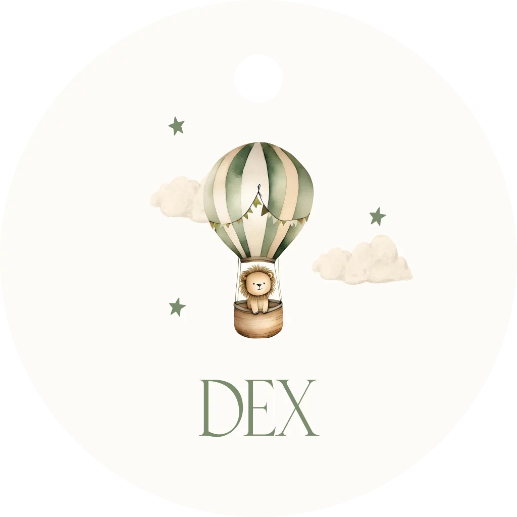 Doopsuiker labeltje in de stijl van het geboortekaartje. Dit labeltje heeft een beige achtergrond met daarop een luchtballon met leeuwtje. Pas het ontwerp naar wens zelf aan.