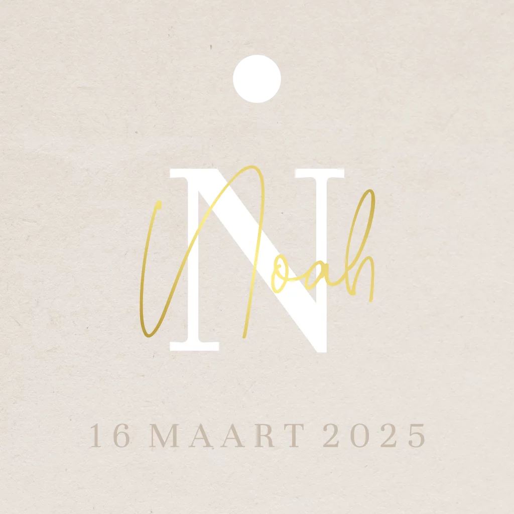 Doopsuiker labeltje in de stijl van het geboortekaartje. Dit labeltje heeft een beige achtergrond met daarop een initiaal en goudfolie details. Pas het ontwerp naar wens zelf aan.