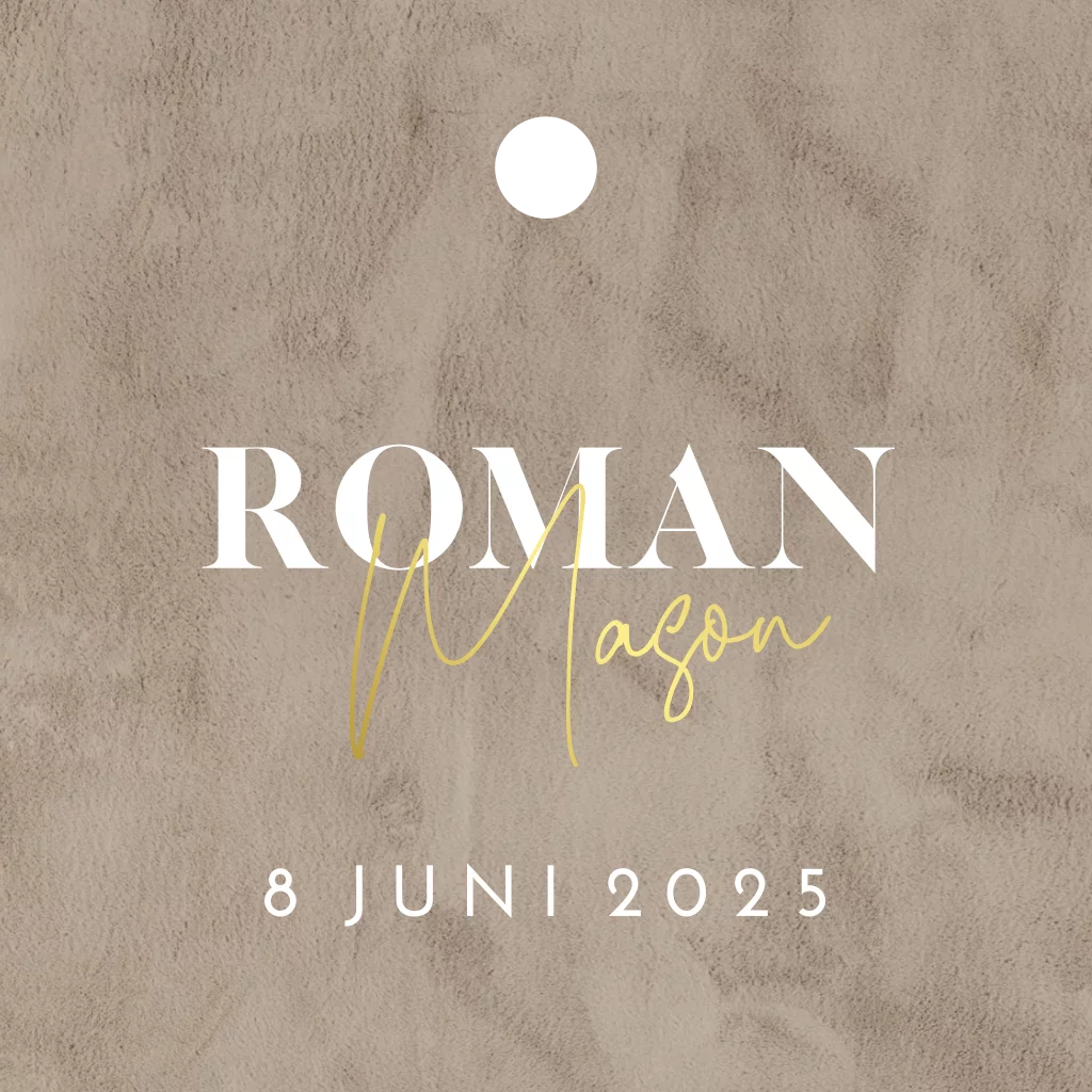 Doopsuiker labeltje in de stijl van het geboortekaartje. Dit labeltje heeft een beige velvet-look achtergrond met daarop de naam in goudfolie. Pas het ontwerp naar wens zelf aan.