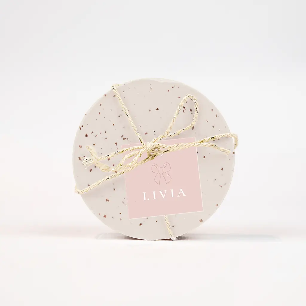 Doopsuiker labeltje in de stijl van het geboortekaartje. Dit labeltje heeft een roze achtergrond met daarop een lieve foto van een strikje. Pas het ontwerp naar wens zelf aan.