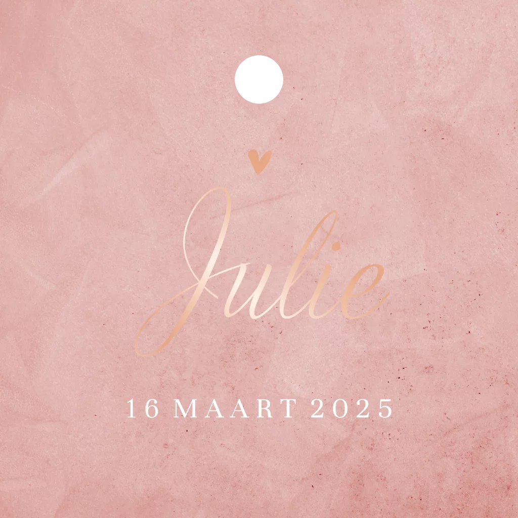 Doopsuiker labeltje in de stijl van het geboortekaartje. Dit labeltje heeft een roze velvet-look achtergrond met daarop de naam in roségoudfolie. Pas het ontwerp naar wens zelf aan.
