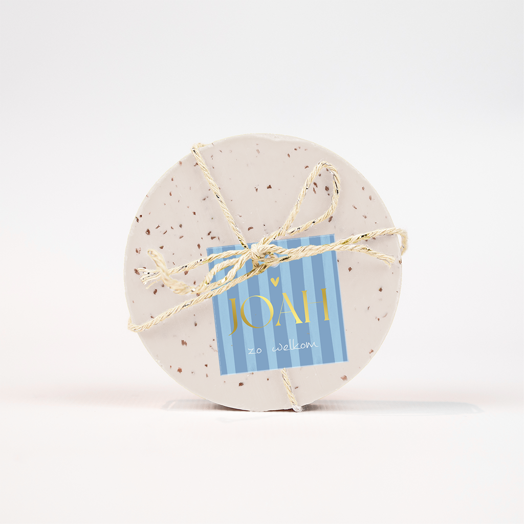 Doopsuiker labeltje in de stijl van het geboortekaartje. Dit labeltje heeft blauwe strepen met daarop de naam in goudfolie. Pas het ontwerp naar wens zelf aan.