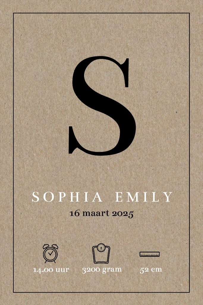 Stoer kraft geboortekaartje voor de geboorte van je dochtertje met initiaal op echt kraft karton.