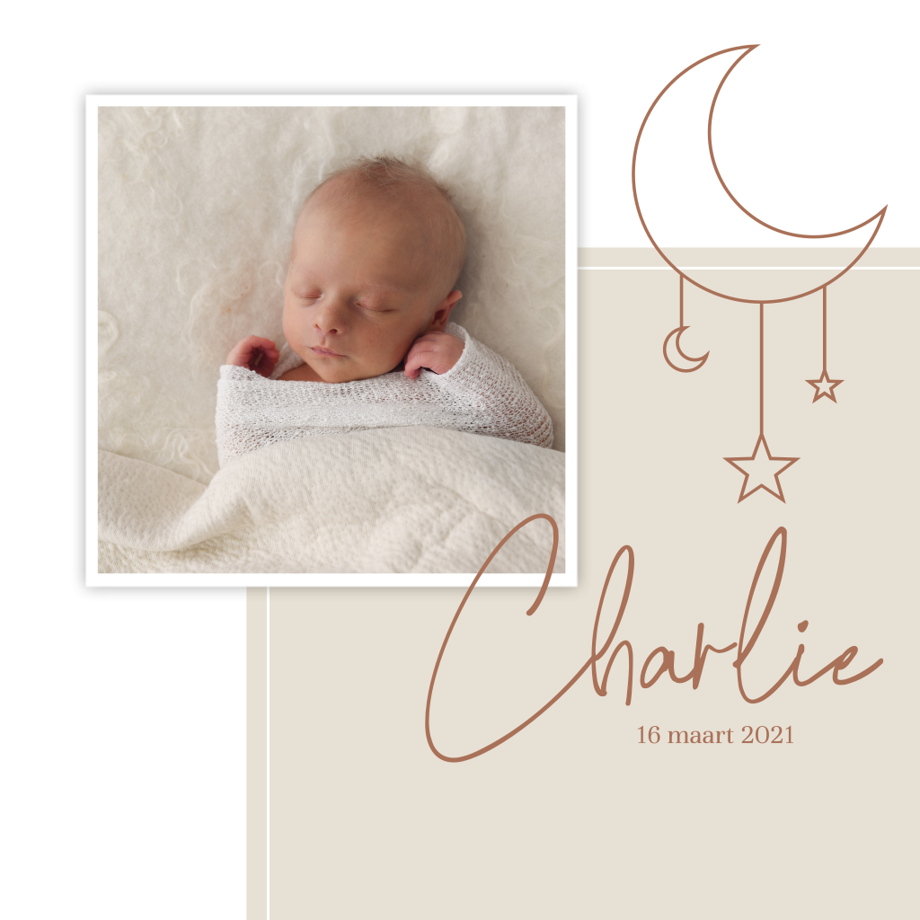 Een hip kaartje voor de geboorte van jullie dochtertje. De achtergrond is wit en heeft een beige gekleurd vlak centraal staan. Er is ruimte voor een foto van jullie kleintje. De sterretjes en maan maken het helemaal af. De mooie foto is gemaakt door Yvettemoeskops.nl