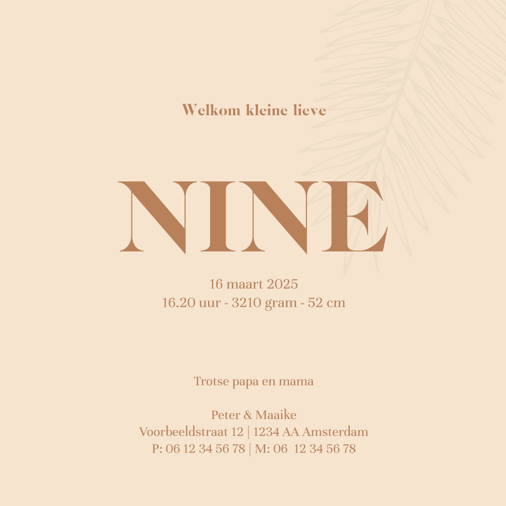 Een minimalistisch kaartje voor de geboorte van jullie kindje. De achtergrond heeft een beige kleur en de details zijn beige gekleurd. De naam wordt vormgegeven in een strak lettertype. Op de achtergrond zijn wat subtiele botanische elementen te zien.