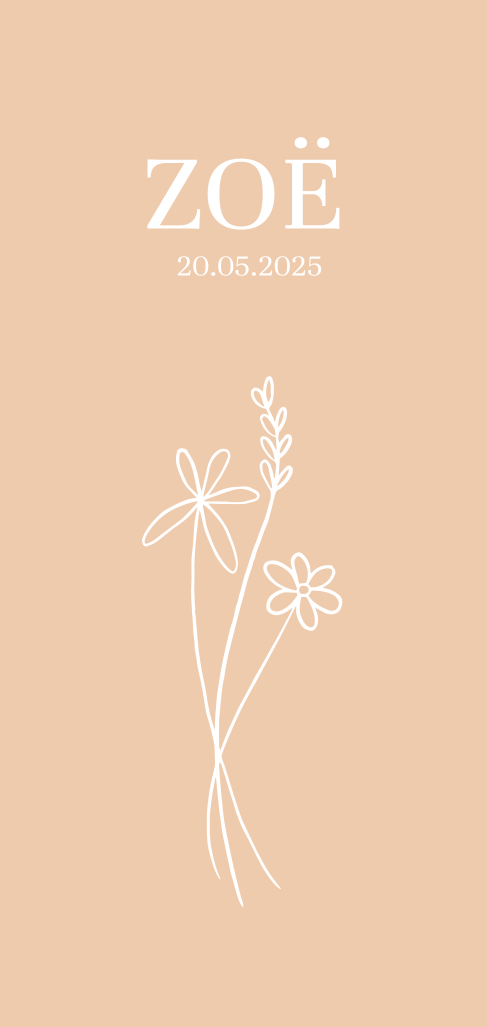 Hippe geboortekaart als geboorteaankondiging met een lief bosje bloemen op een peach kleurige achtergrond.