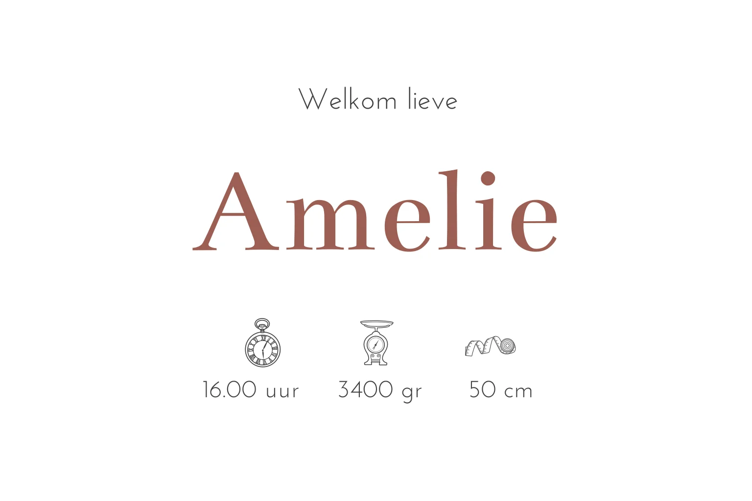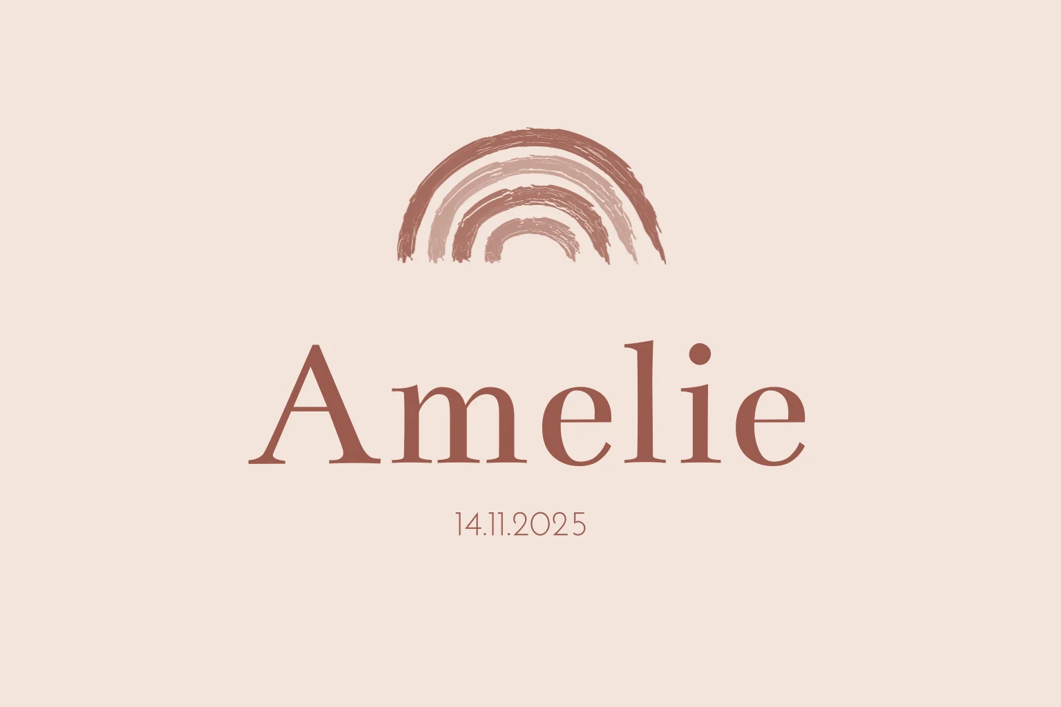 Trendy geboortekaart voor je dochter met hippe roestbruine regenboog op een zacht roze achtergrond.