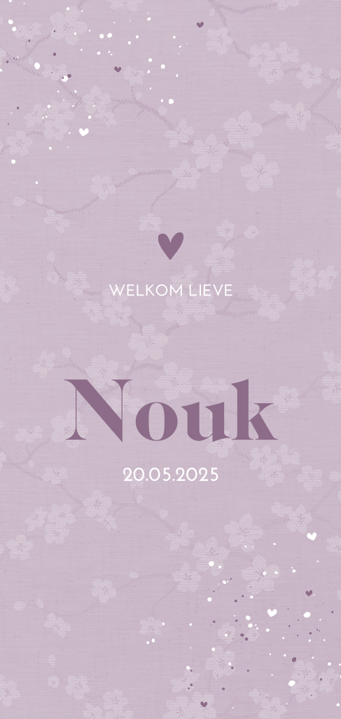 Dit is een lief kaartje voor jullie pasgeboren dochter. Het kaartje heeft een paarse stof-look achtergrond met bloemenpatroon. De kleine spetters en hartjes in de hoeken maken dit kaartje extra feestelijk. Het kaartje is naar wens aan te passen in onze online editor. Bestel snel een proefdruk om dit kaartje in het echt te bewonderen!