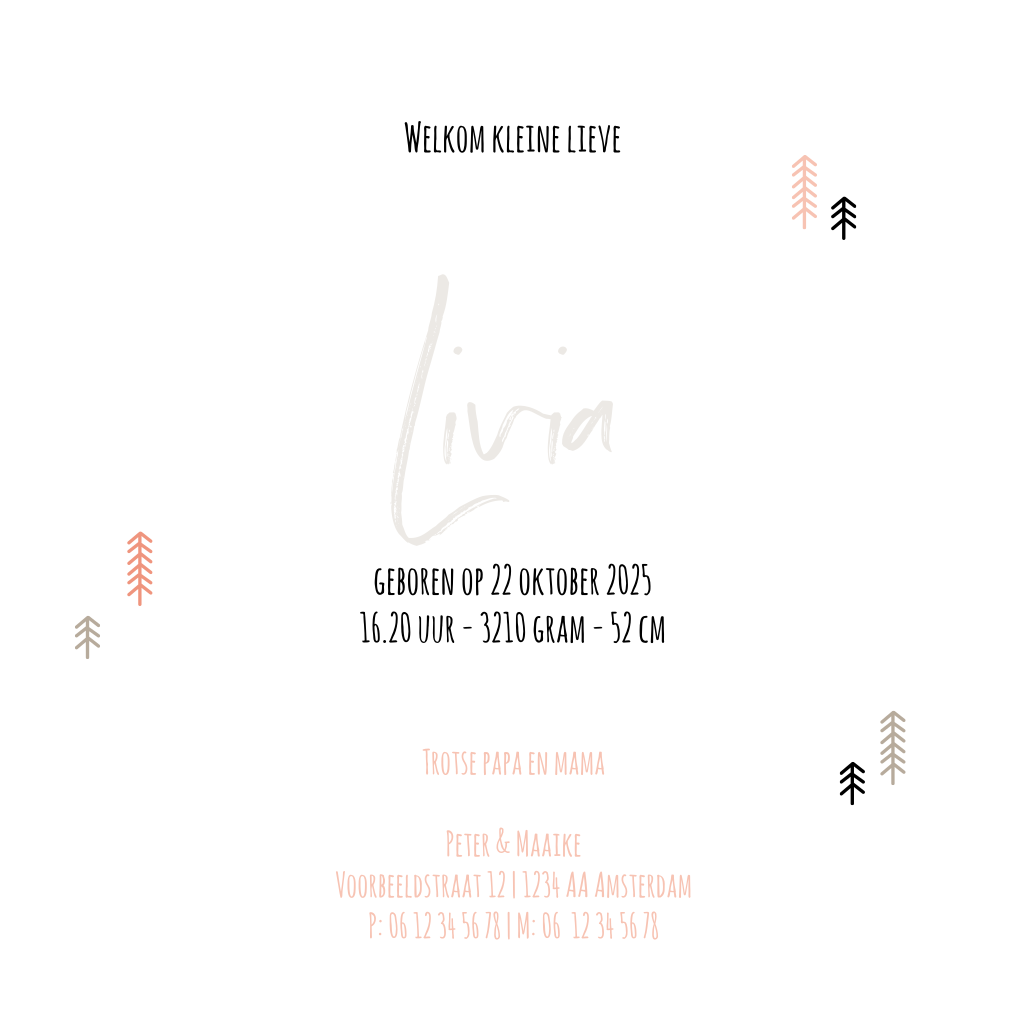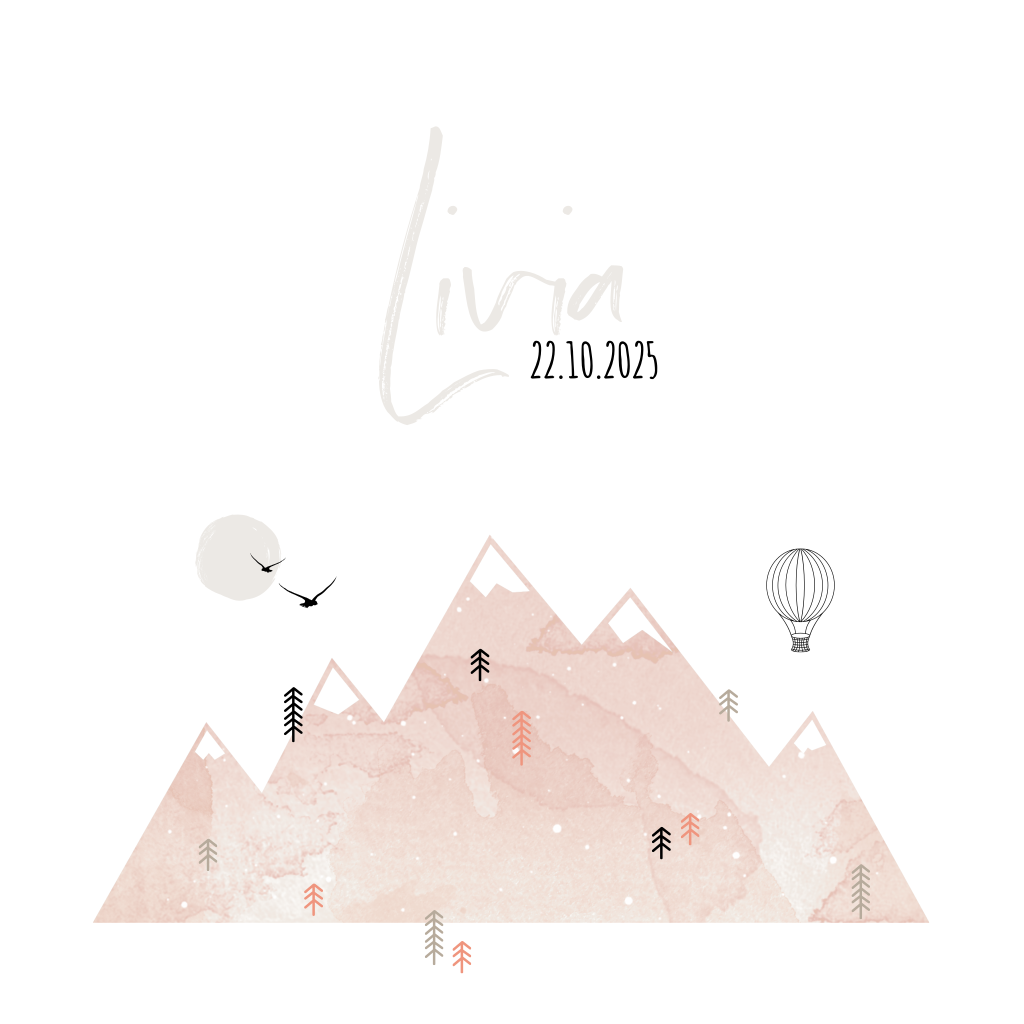 Avontuurlijk geboortekaartje voor de geboorte van je stoere kleine meid met roze bergen en hippe boompjes met daarboven een zwevende luchtballon.