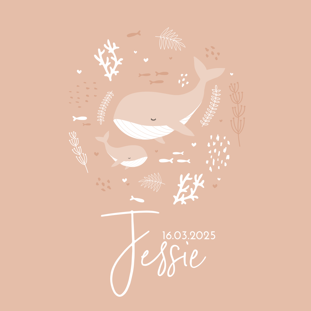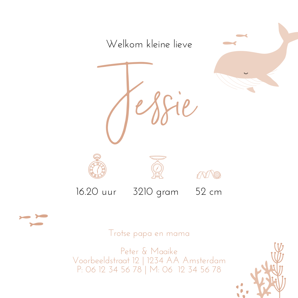 Hip illustratief geboortekaartje voor je pasgeboren dochter met hippe illustraties van waterdieren zoals walvisjes en visjes op een peach achtergrond.