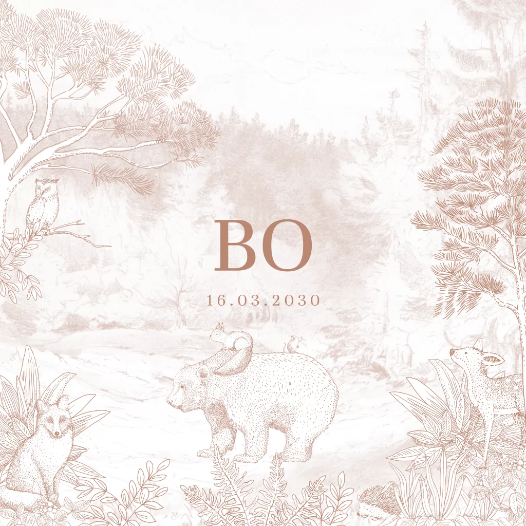 Kondig de geboorte van jullie zoon of dochter aan met dit lieve kaartje! Bosdieren zijn getekend in een bos. De roestbruine kleur geeft dit kaartje een warme uitstraling. Pas het kaartje naar wens aan in onze online editor en bestel snel een proefdruk om dit kaartje in het echt te zien!