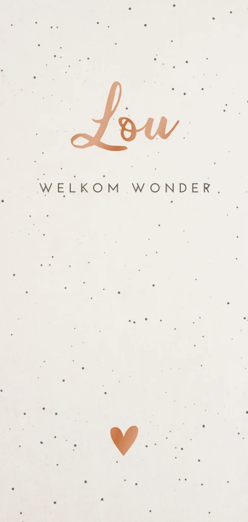 Dit is een lief kaartje voor de geboorte van jullie dochter of zoon. Het kaartje heeft een lichte achtergrond met donkere stipjes. De naam en het hartje worden gedrukt in hoogglans en geven dit kaartje een luxe uitstraling. Pas het kaartje naar wens aan in onze online editor en bestel snel een proefdruk om dit kaartje in het echt te zien!