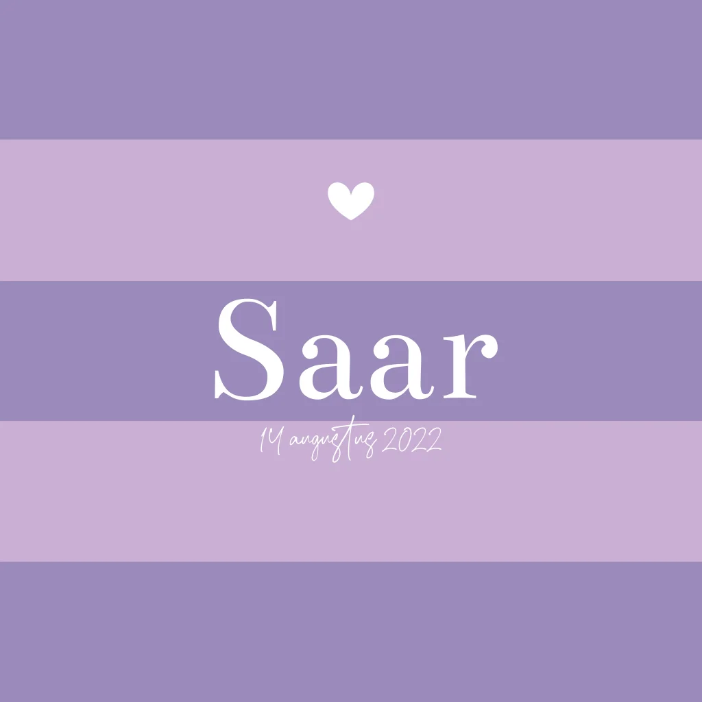 Dit is een stoer geboortekaartje voor jullie dochtertje. Het kaartje heeft een gestreepte paarse achtergrond. De witte typografie en het hartje komen mooi naar voren. Ook zo'n fan van dit kaartje? Bestel een proefdruk en bewonder het kaartje in het echt!