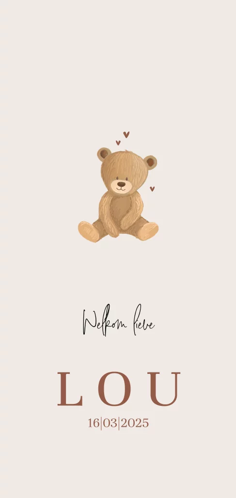 Kondig de geboorte van jullie zoon of dochter aan met dit lieve kaartje! Het kaartje heeft een lichte achtergrond met de tekening van een zittende beer. De hartjes geven dit kaartje en extra lief effect. Het kaartje kan naar wens aangepast worden in onze online editor.