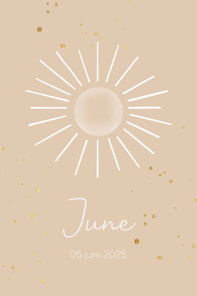Goudfolie geboortekaartje met zon en gouden spetters