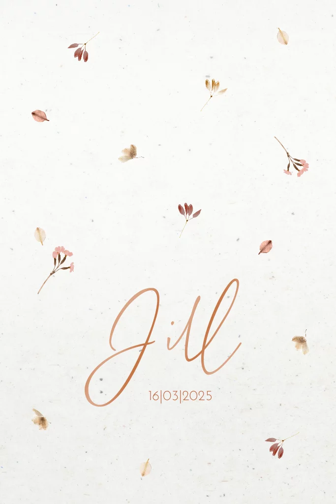 Een schattig hoogglans geboortekaartje voor een meisje. Het kaartje heeft lieve kleine droogbloemen op de achtergrond. De naam is gedrukt in hoogglans. Pas het kaartje gemakkelijk zelf aan in onze online editor.