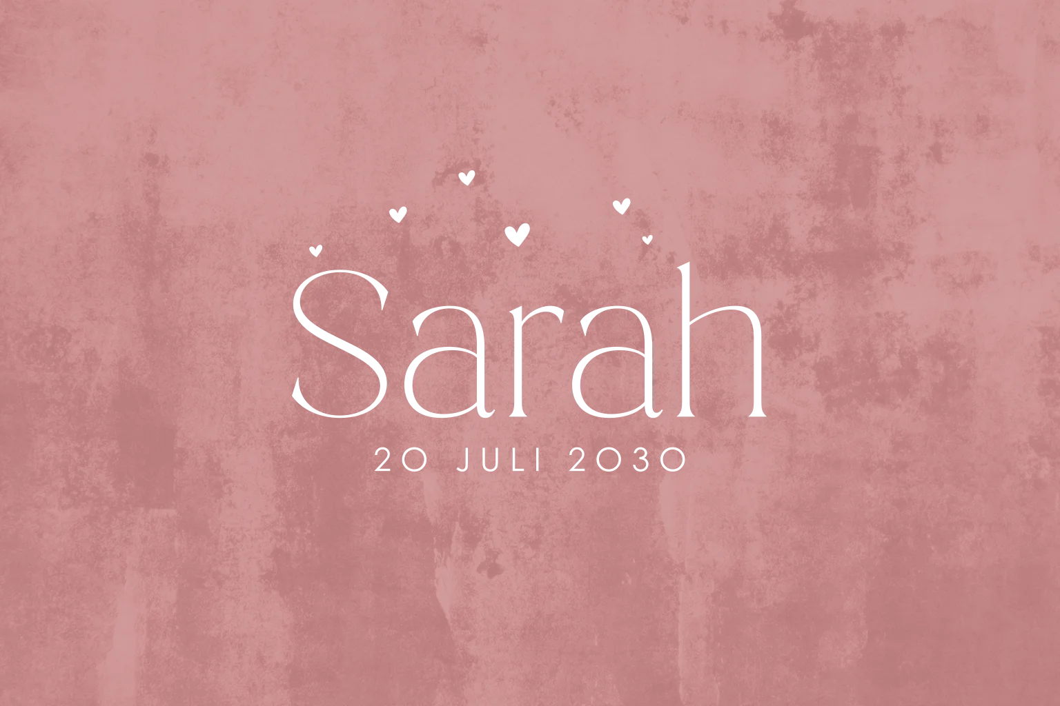 Origineel roségoudfolie geboortekaartje om de geboorte van je dochter aan te kondigen. De velvet look achtergrond en ronde hoeken zijn helemaal van nu! De lieve hartjes en naam worden gedrukt in roségoudfolie. Liever een andere kleur folie? Dit pas je gemakkelijk aan in de online editor.