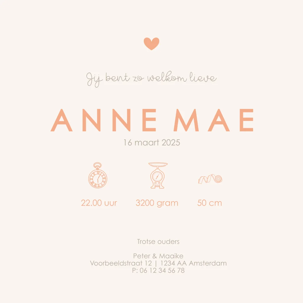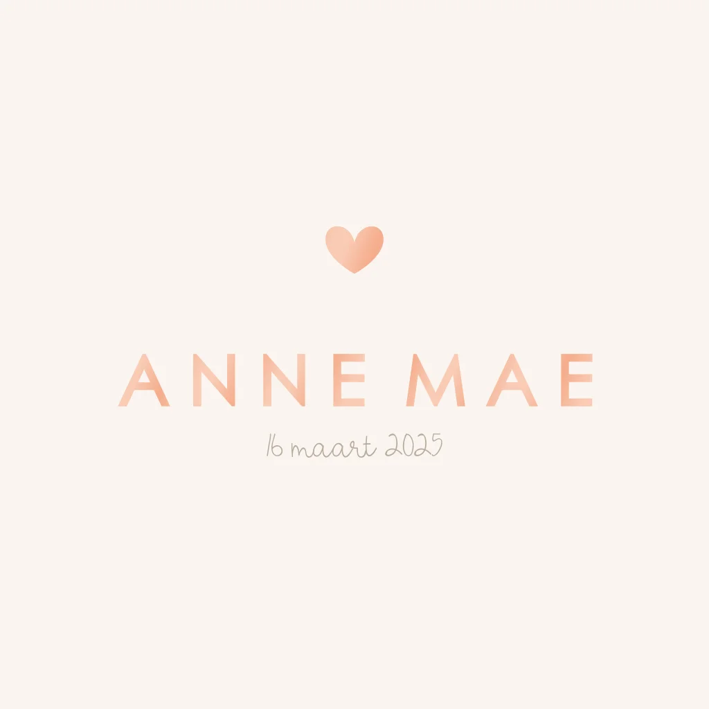 Minimalistisch geboortekaartje meisje met hartje en hoogglans