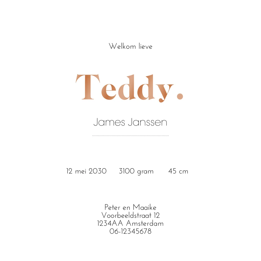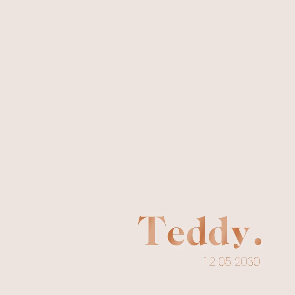 Kondig de geboorte van jullie zoon of dochter aan met dit stijlvolle kaartje. De lichte achtergrond geeft dit kaartje een rustige uitstraling. Rechtsonder in de hoek worden de naam en geboortedatum gedrukt in hoogglans. Pas het kaartje naar wens aan in onze online editor en bestel snel een proefdruk om dit kaartje in het echt te zien!