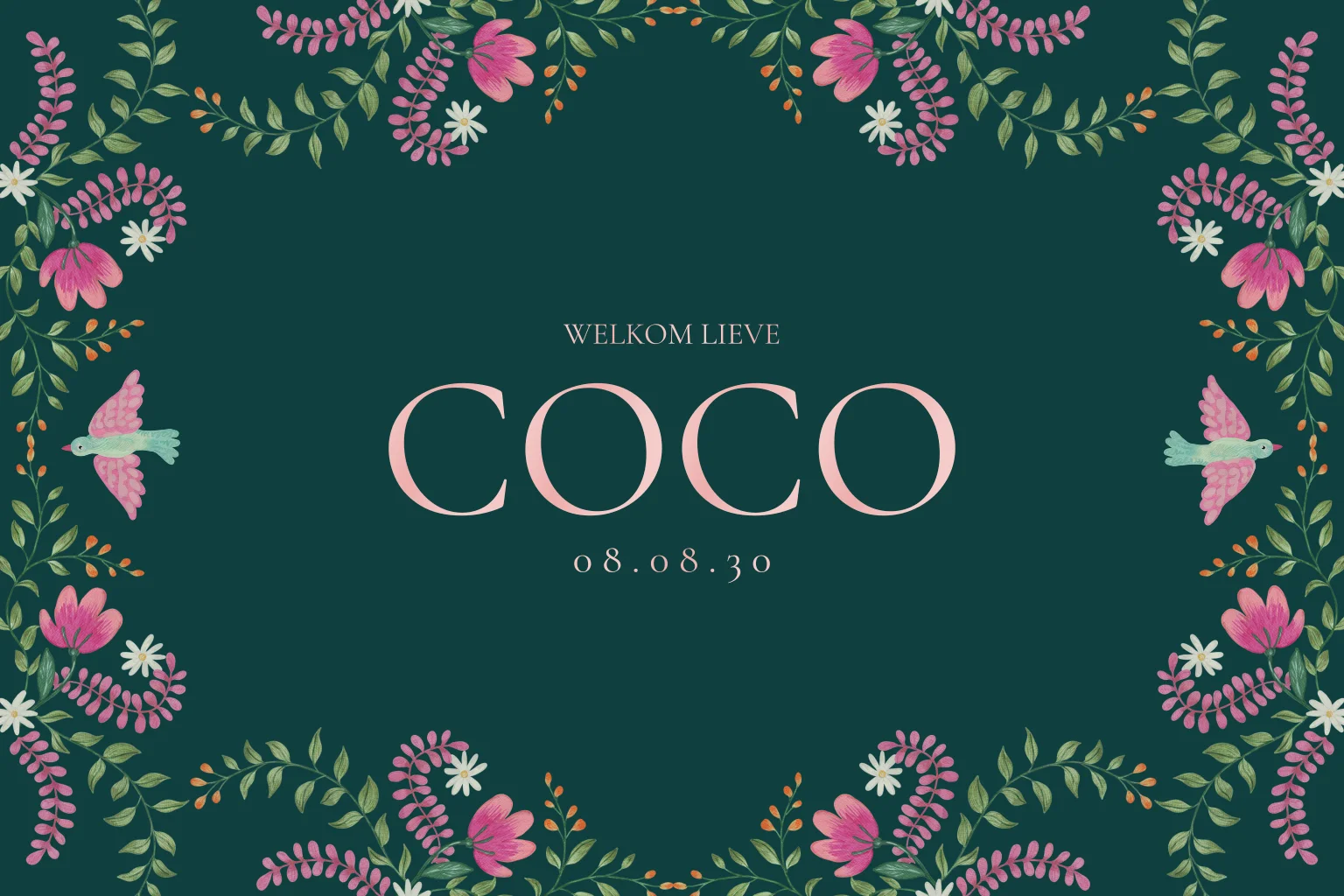 Een charmant geboortekaartje met bloemen in groen en roze. Dit magische geboortekaartje met folk style illustraties is extra chique met de hoogglans, ook wel de spot-uv genoemd. Dit maakt het kaartje luxe. Leuk voor zowel in de herfst als in de lente. Pas het ontwerp naar wens aan in onze online editor.