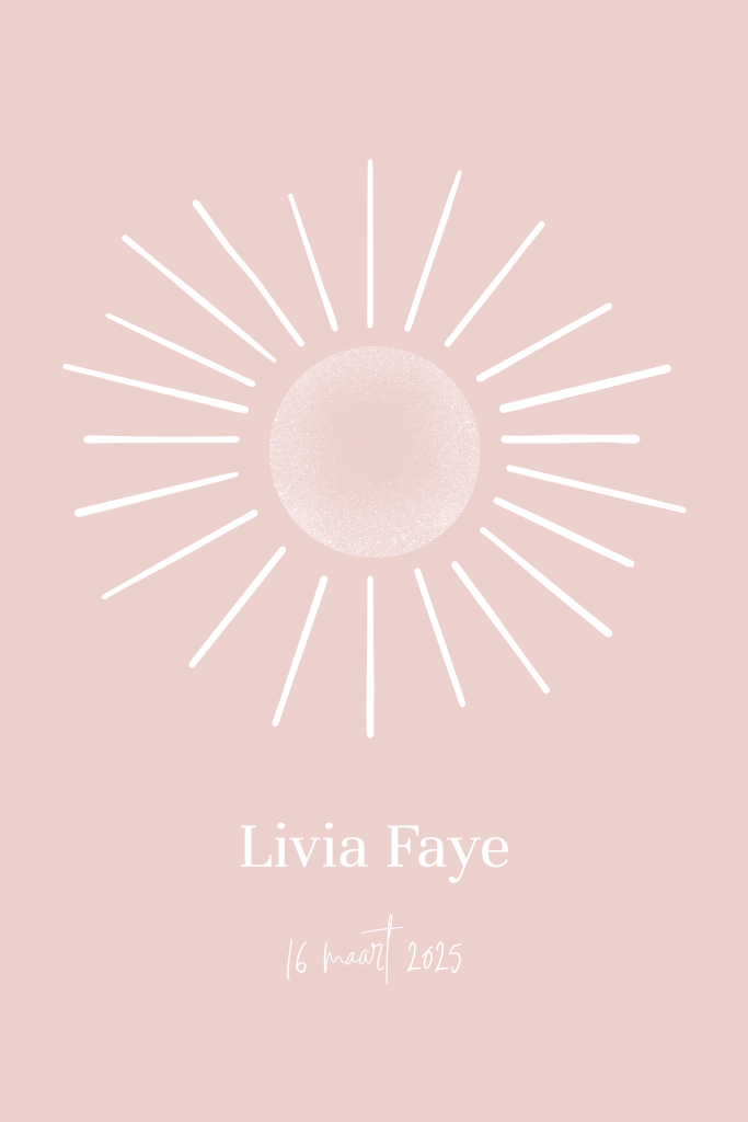 Trendy geboortekaartje met goudfolie zon en poederroze achtegrond